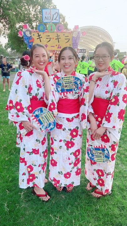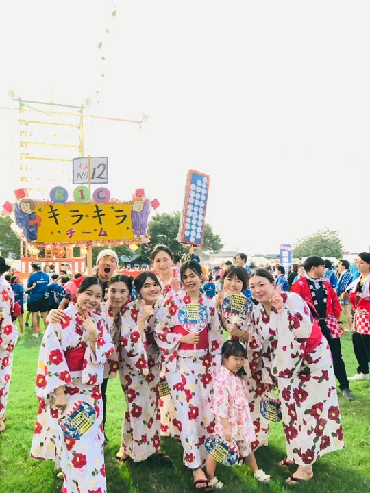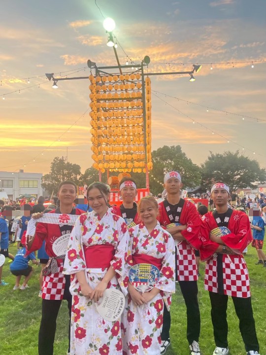 実習生たちにとって、日本の盆踊りは初めての経験。週末を使って練習を重ねてきました。当日は揃いの浴衣を羽織って、皆のモチベーションも最高潮に。猛暑の夜でしたが、一生懸命踊り切りました。彼らにとって、日本の思い出の大切な1ページになってくれたらと切に願っています。