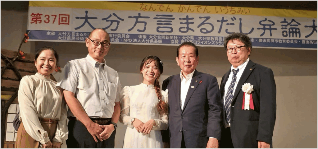 11人目のトリとして、豊後高田市で働くベトナム人特定技能実習生のホ・サン・トラ・リエンさんが出場。『私の母はスーパーヒーロー』というタイトルで、ベトナムに住むお母様やご家族との心温まるエピソードを、大分弁を交えながら披露しました。受賞こそなりませんでしたが、外国人として日本語の弁論大会に出場した経験、また日本の貴重な文化である方言を学んだ経験は、彼女にとってかけがえのないものとなったでしょう。トラ・リエンさん、お疲れ様でした!
