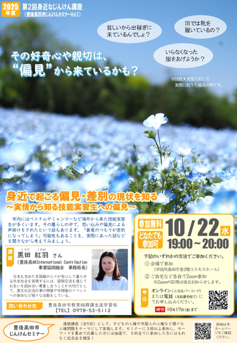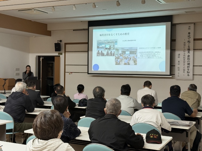令和7年10月22日、豊後高田市主催の「身近なじんけん講座」において、当組合の 黒田 紅羽 事務局長が「外国人の人権」をテーマに講演を行いました。